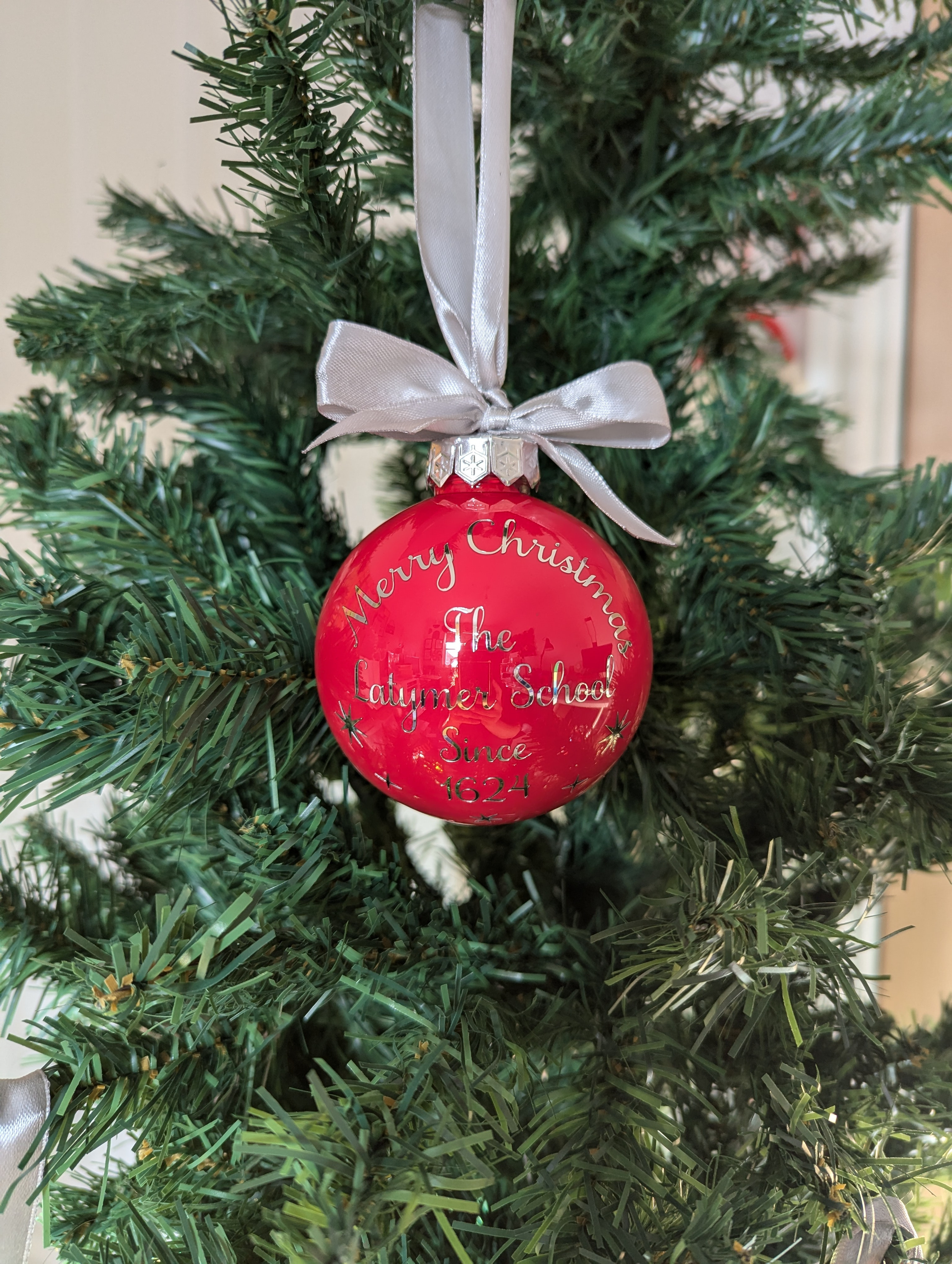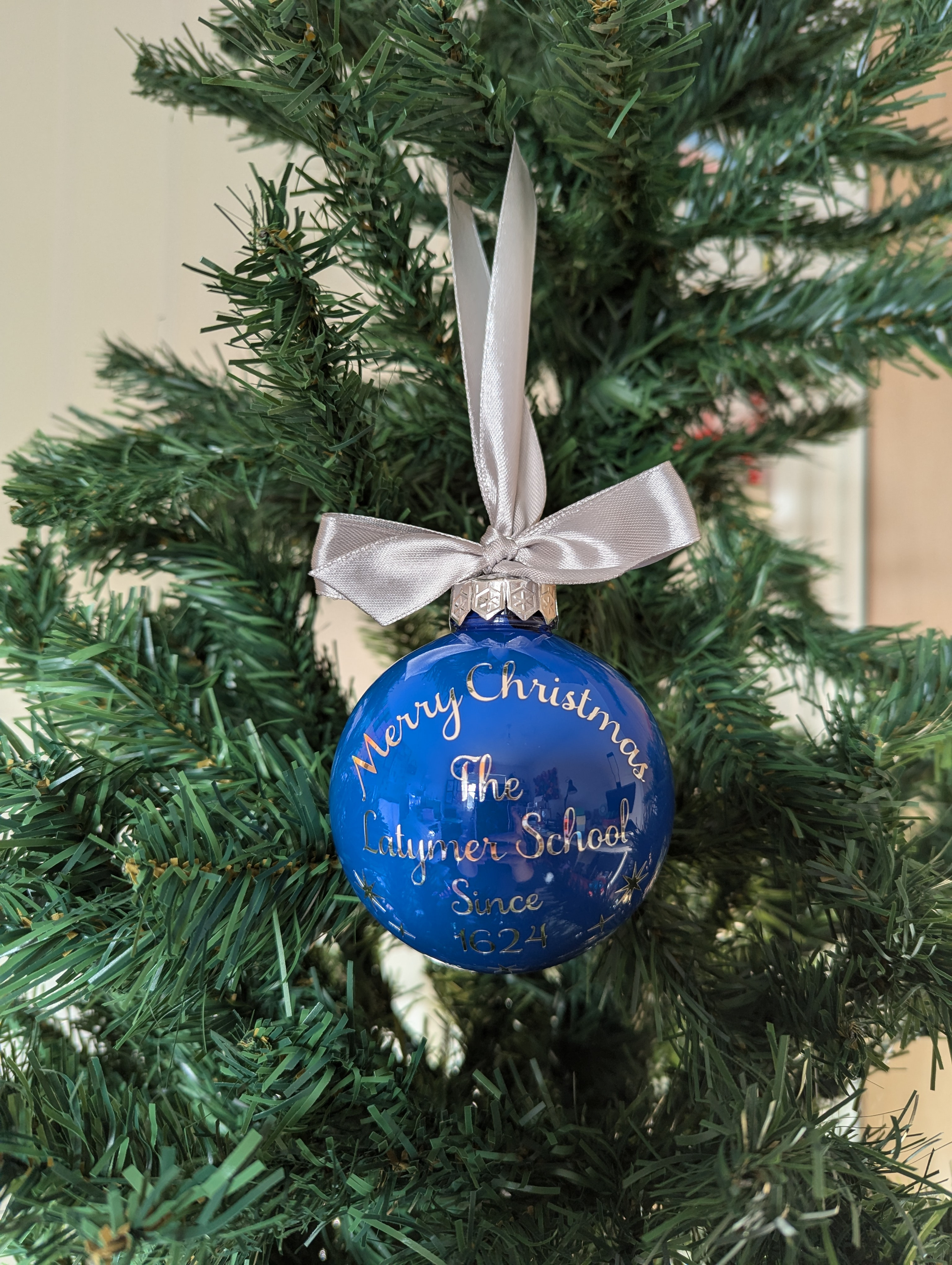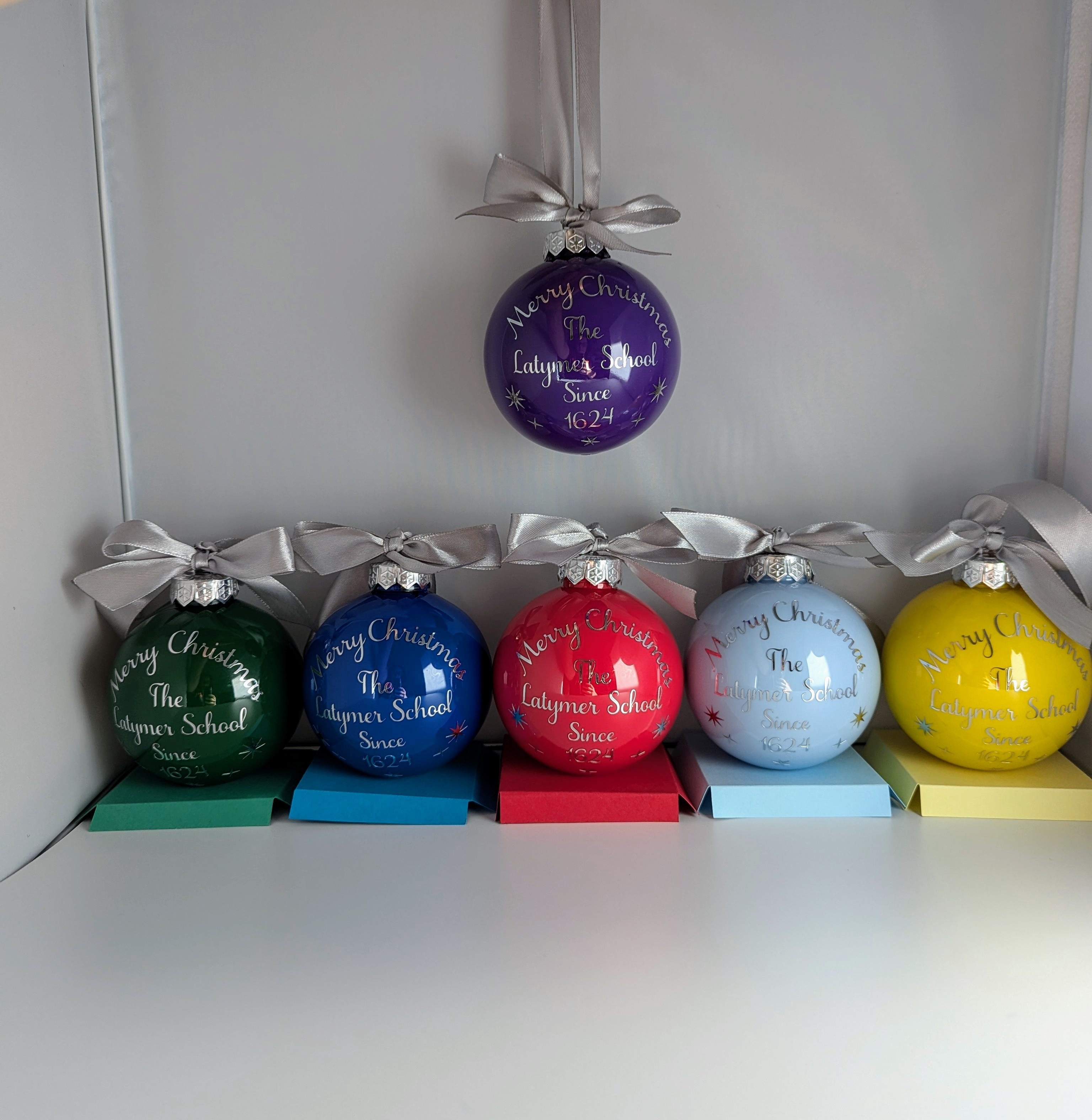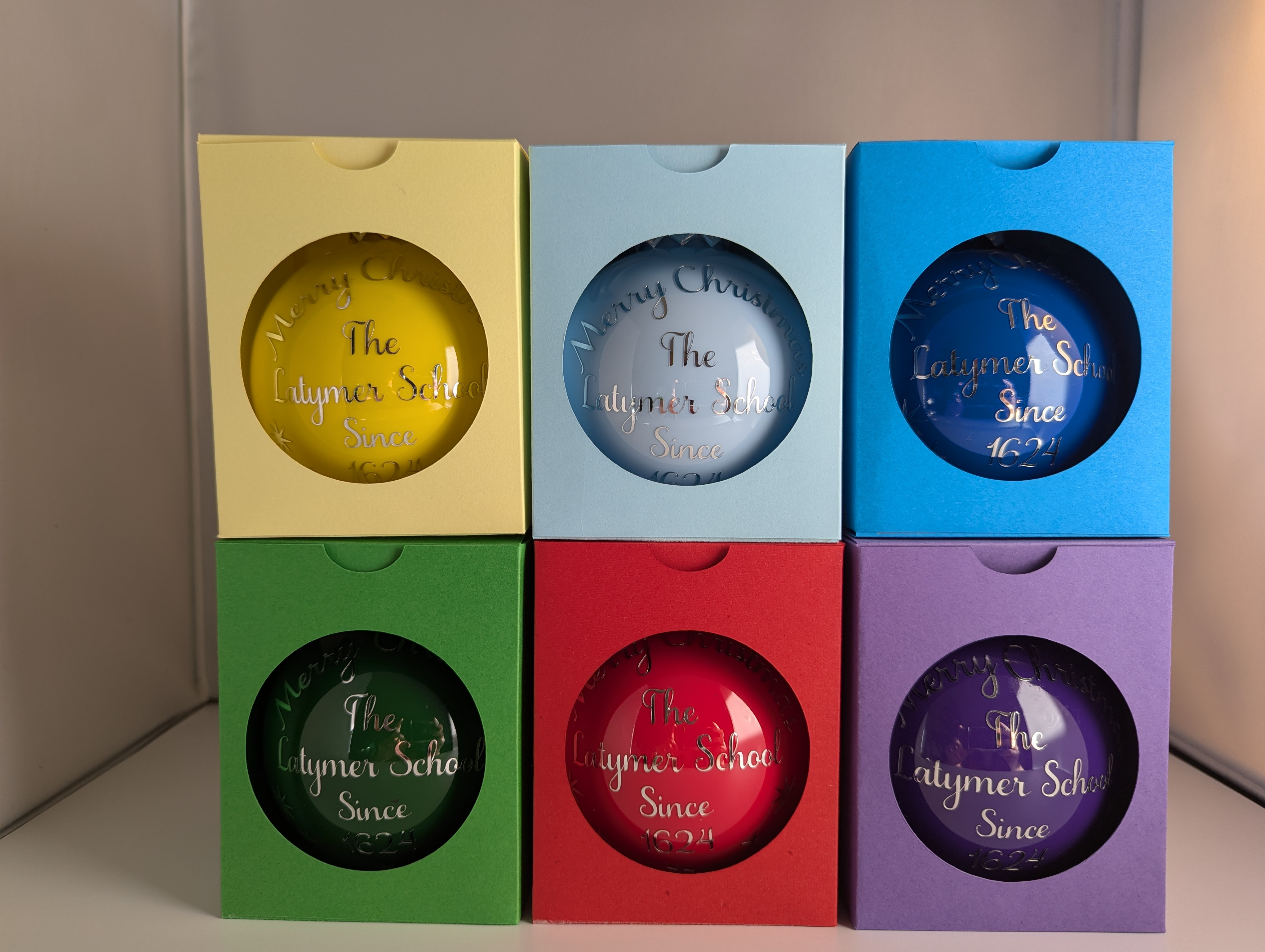 Lovely Limited edition Latymer Christmas baubles, available for £6.99 for each colour and delivered to the school for your child to collect.